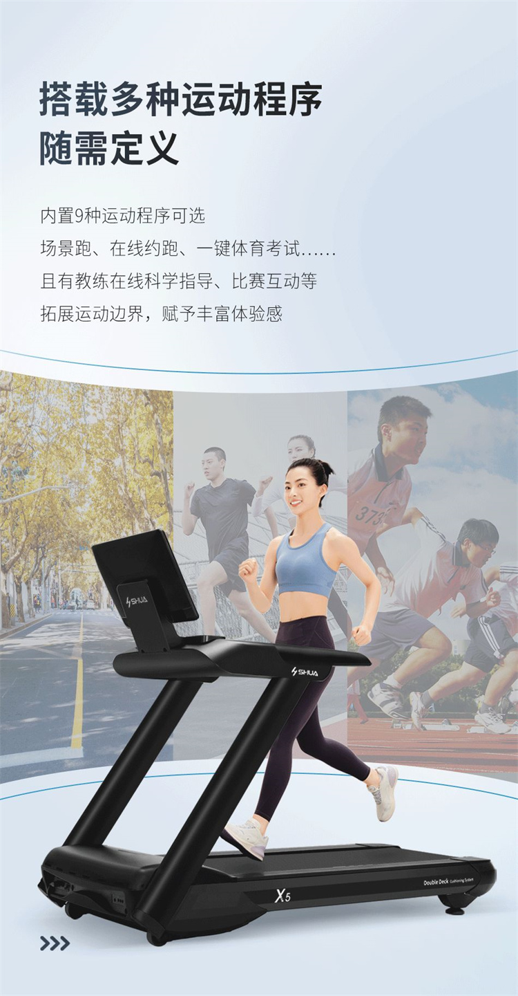 舒华X5 Pro豪华智能跑步机采用全新舒华跑步机系统,搭载21.5寸大屏,内置九种运动程序,包括场景跑、在线约跑和一键体育考试等内容,亦有教练在线科学指导和比赛互动,可在线升级,历经耐久性测试,让您使用更安全,双跑台设计,全减震系统,核心动力采用F级耐高温马达,5.0HP峰值马力,提供源源动力,让您享受每一次畅跑体验。